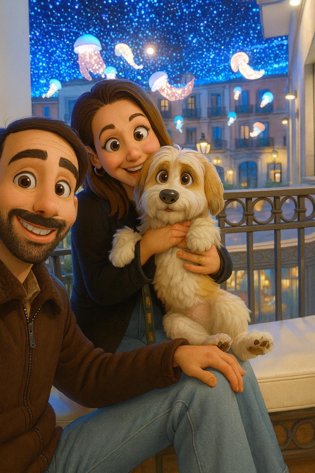 Il nostro ritratto di coppia con il nostro cagnolino è adorabile! 😍 Ci ha fatto sorridere subito, sembra davvero catturare la nostra complicità… e il musetto birbante del cane è identico! 🐾